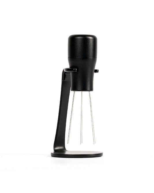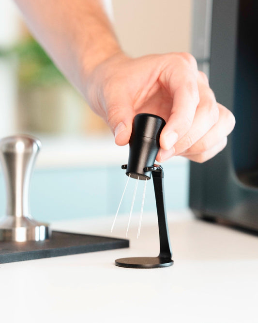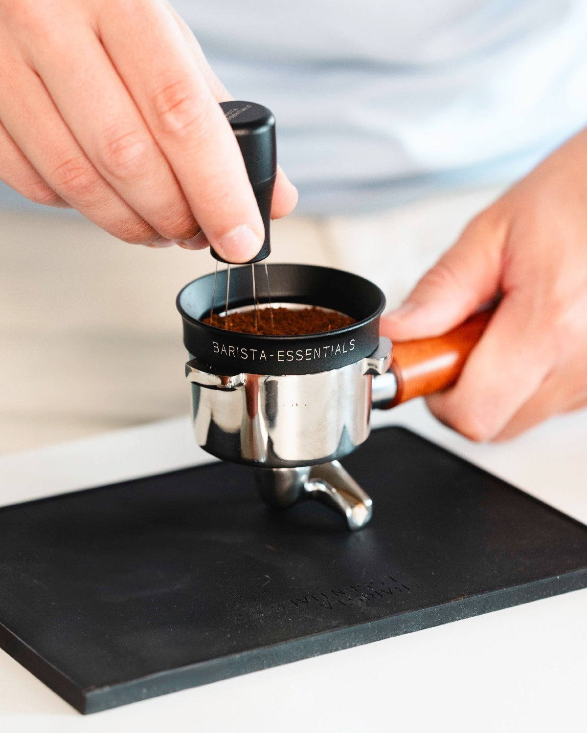 Na het malen roer je met deze tool door de koffie (zorg dat je doseerring er nog op zit). Zo breek je alle klontjes en verdeel je de koffie perfect voor het tampen. En geloof me: dit maakt meer impact dan je denkt.