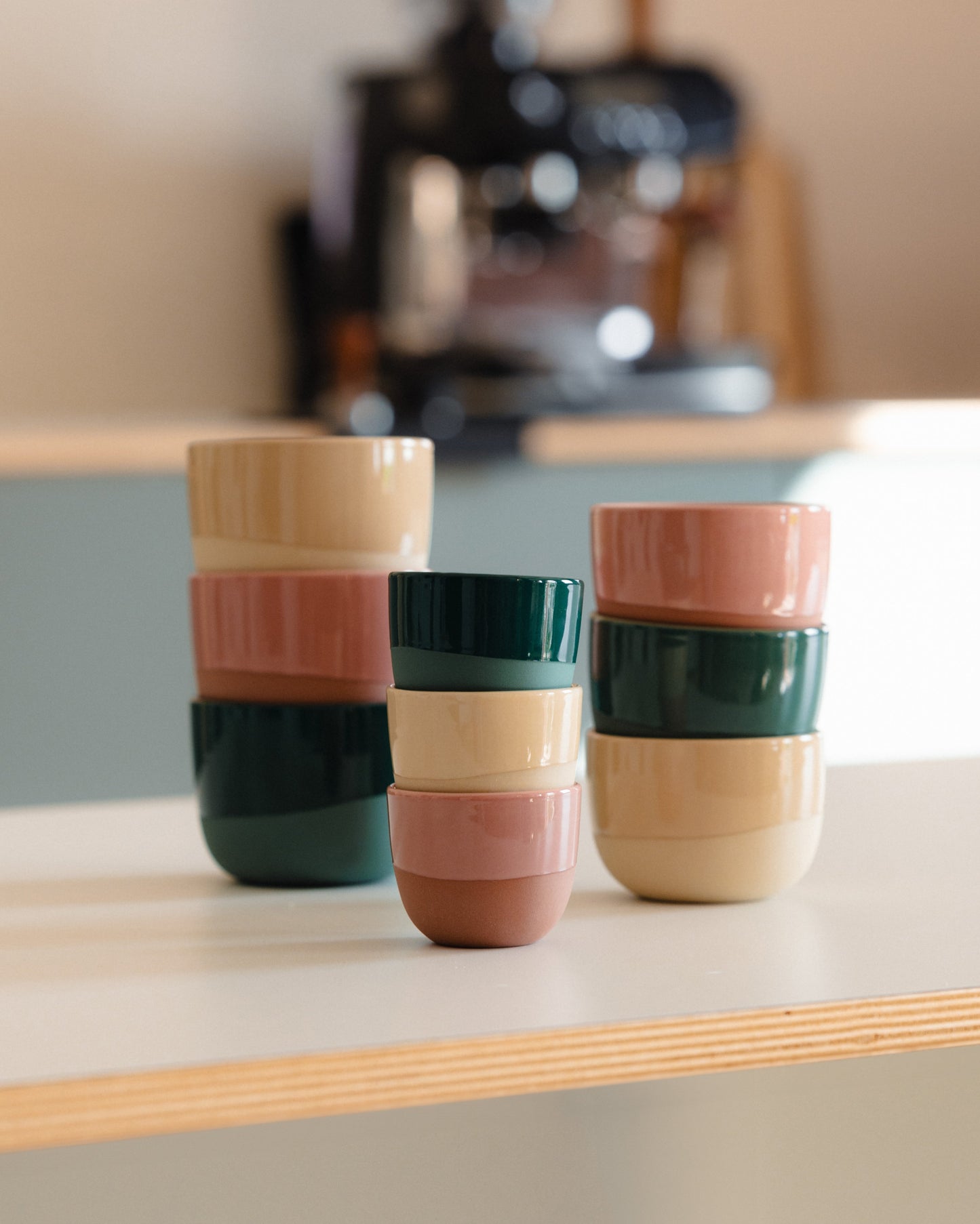 The result? These stunning half-glazed cappuccino cups in three unique colors. Guaranteed to look great on your machine and coffee table.