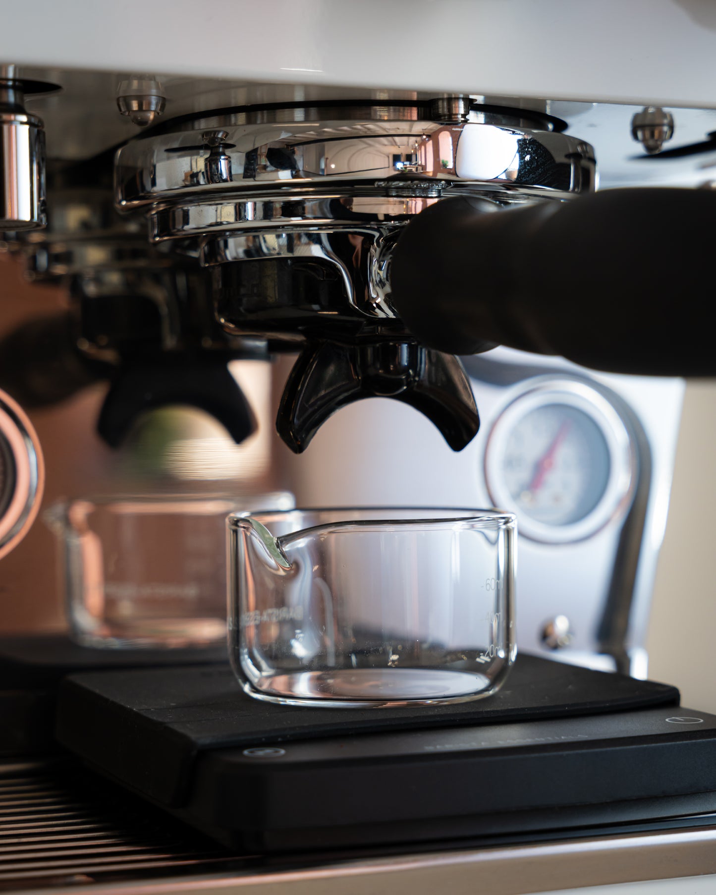 Before I (Jasper) had my barista cups, I was always awkwardly squeezing my way-too-big mugs between my portafilter and my coffee scale.